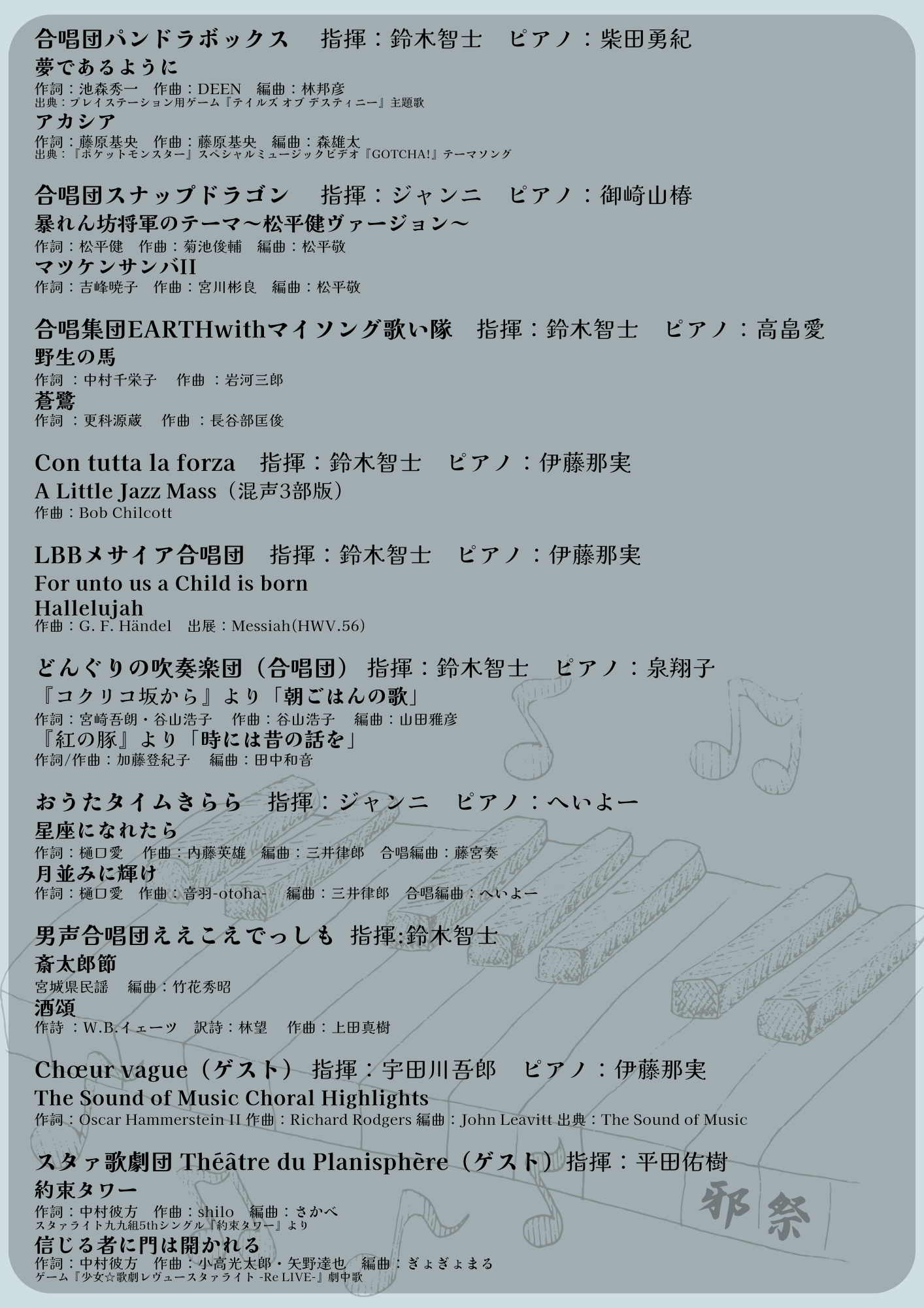 ジャズミサという合唱界の人気曲をバンド付き編成で取り組むCon tutta la forza、定番合唱曲を楽しむコンセプトの合唱集団EARTHと、マイソング歌い隊とが組んだ、合同のクラス合唱ステージ、ド定番合唱作品の一つであるメサイアに正面から取り組むLBBメサイア合唱団、私初の男声合唱団で、こちらも定番曲に取り組むええこえでっしもが登場します。